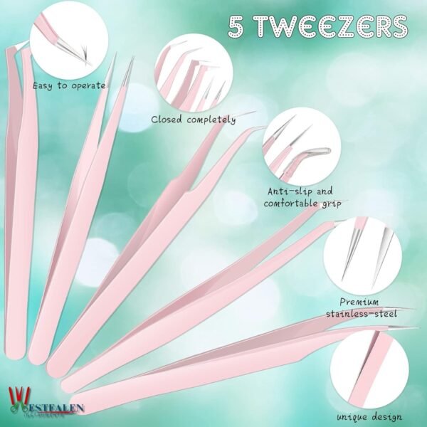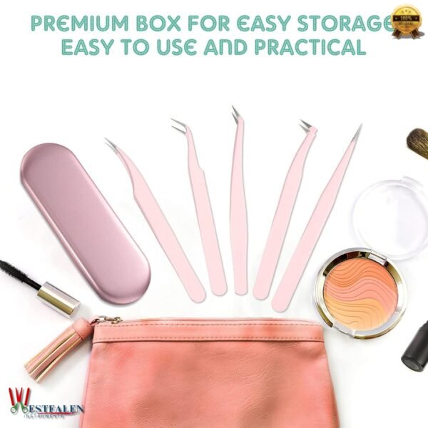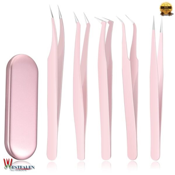 5 Pcs Eyelash Extension Tweezers Set – Volume Lash Tweezers with Straight & Curved Tips – Stainless Steel in Elegant Pink with Storage Box