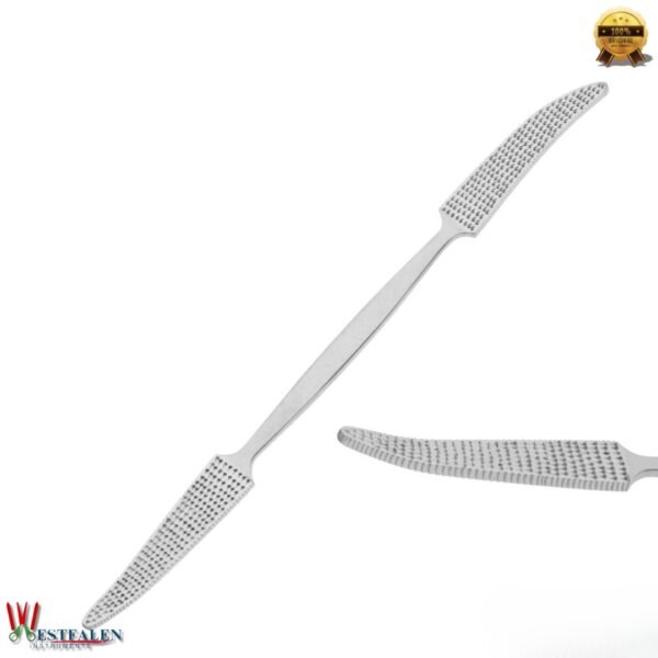 The instrument features a textured handle for a secure grip and improved control, minimizing hand fatigue during extended use. The double-ended design enhances convenience and eliminates the need for multiple tools in a single procedure.