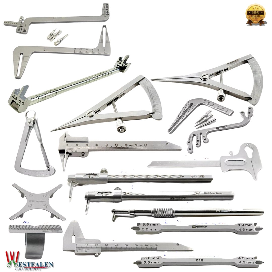 Includes: Castroviejo Calipers (20mm, 40mm), Boley Gauge, Micro Boley (CVD/Str), Duck Barren (S.End/D.End), Iwanson Gauge, Endo Ruler, Star Gauge, and more