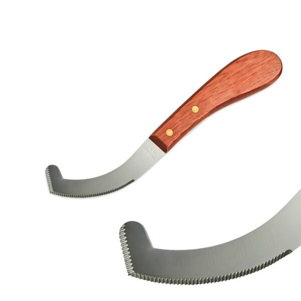 Die gebogene Klinge aus rostfreiem Edelstahl ermöglicht ein exaktes Ausschneiden und Reinigen der Hufe, während der ergonomisch geformte Holzgriff optimal in der Hand liegt – für maximale Kontrolle und Komfort bei jeder Anwendung.