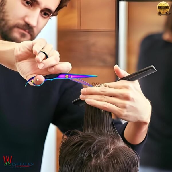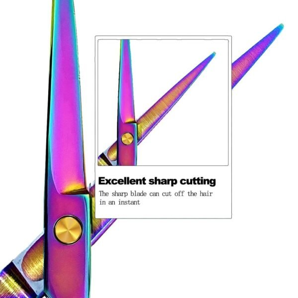 The blades are forged from premium-grade 440C stainless steel using a meticulous hand-polishing technique. The surface features advanced electroplating in a stunning rainbow finish that resists rust, wear, and fading. Ideal for both wet and dry hair, these shears are engineered to preserve hair integrity by delivering clean, tear-free cuts.