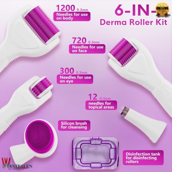 WESTFALEN INSTRUMENTE 6-in-1 Derma Roller Kit for Hair, Beard & Skin – Microneedling Set with 5 Replaceable Heads – 300, 720 & 1200 Titanium Needles
