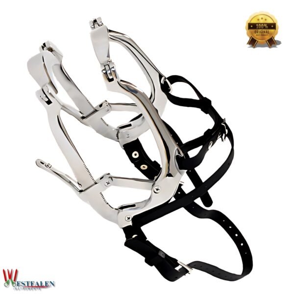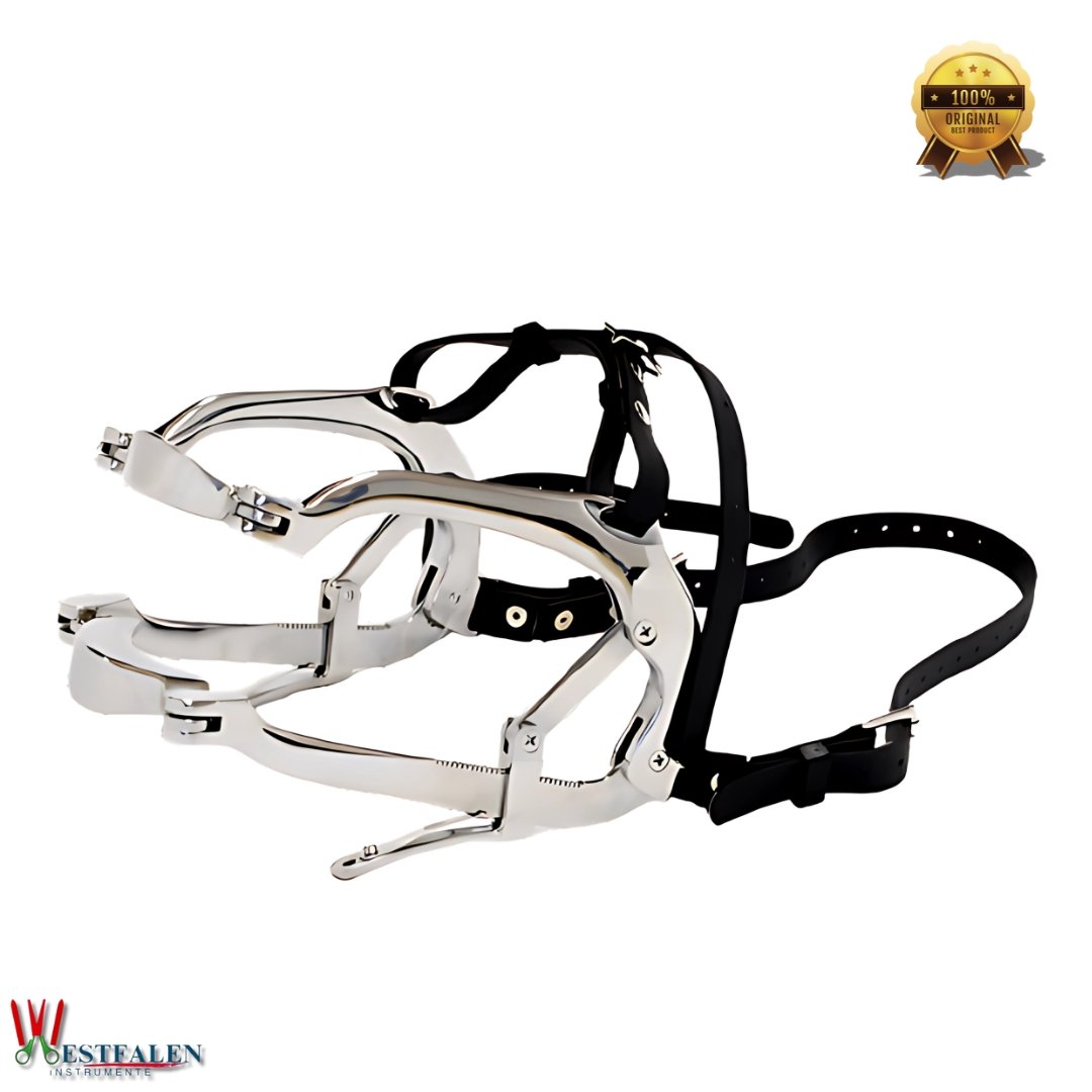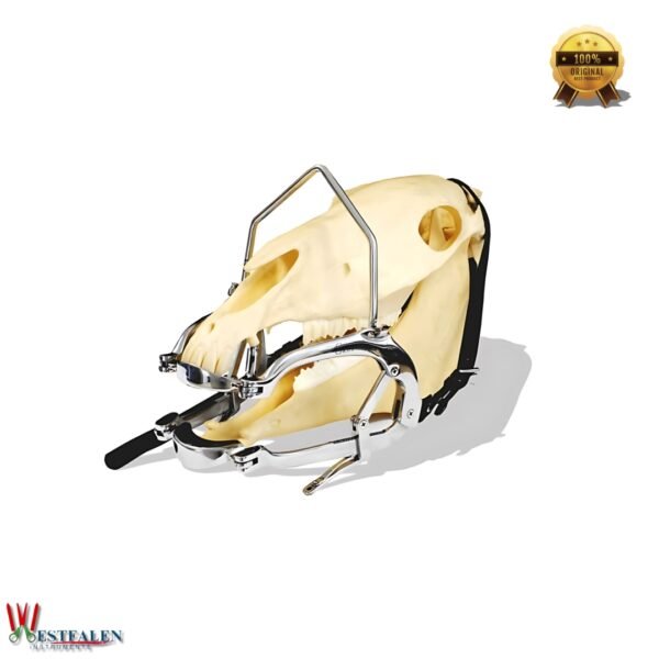 WESTFALEN INSTRUMENTE Stainless Steel Full-Mouth Equine Dental Speculum with Adjustable Ratchets and Leather Restraint Straps