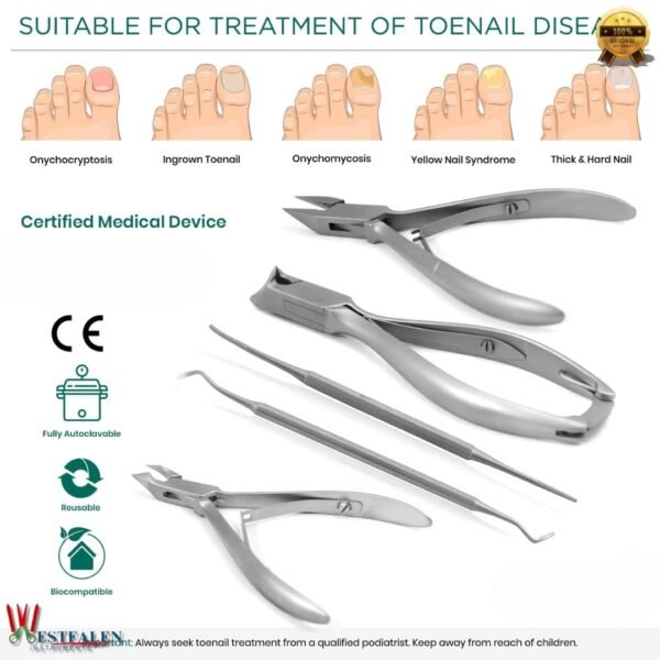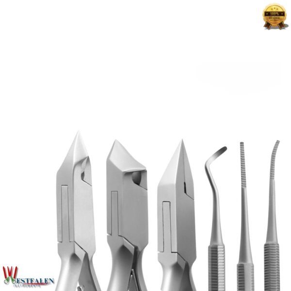Looking for a professional-grade tool kit that covers all your podiatry care needs? The WESTFALENINSTRUMENTE 5-Piece Podiatry Instrument Set is expertly designed to provide accurate, clean cuts and effective treatment of toenails, cuticles, and surrounding areas.